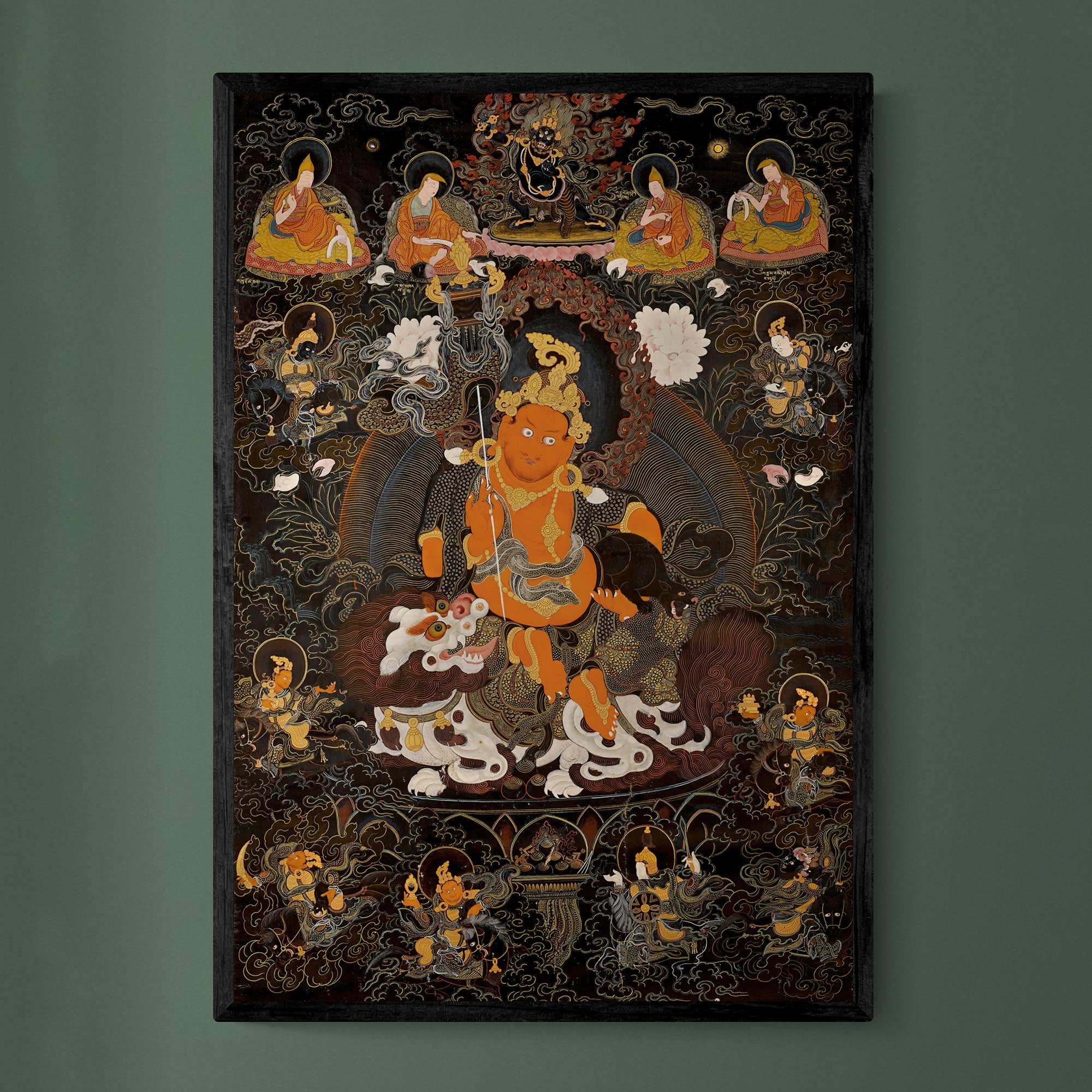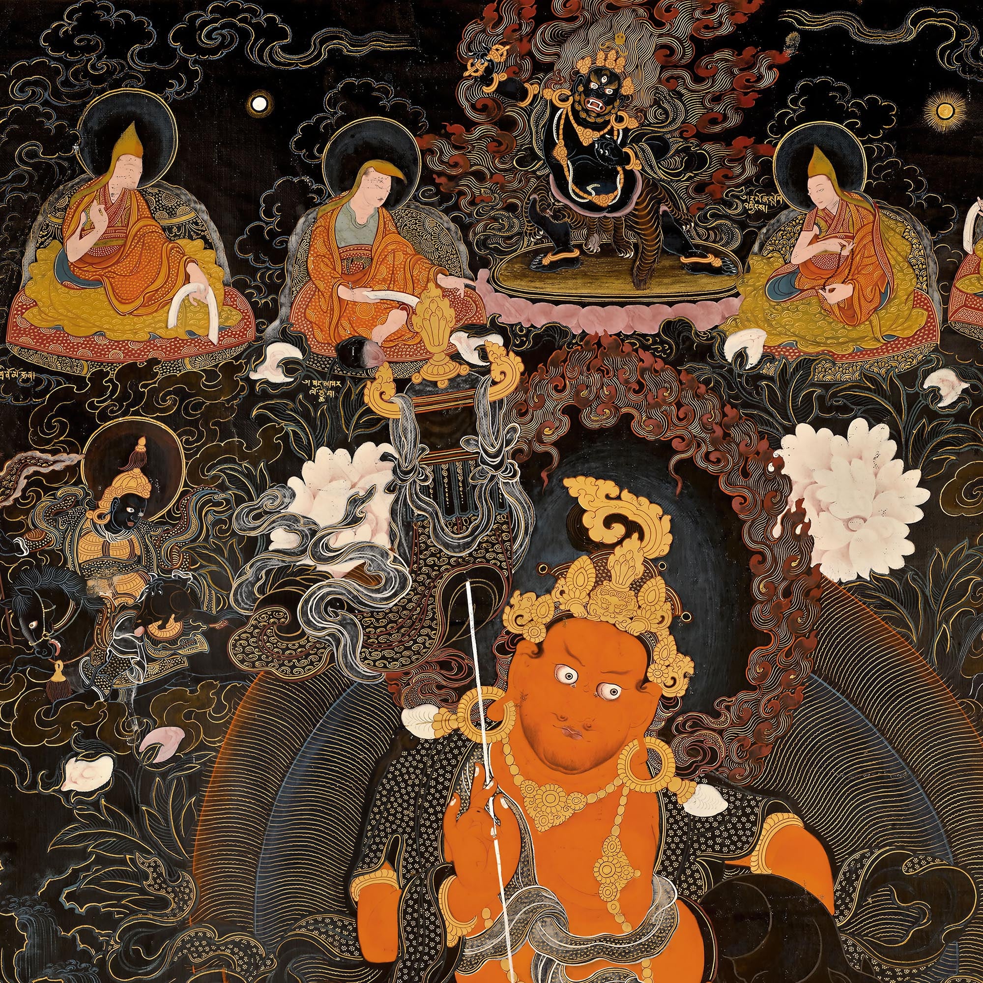 Vaishravana, the northern guardian and lord of worldly abundance, appears here in his full protector form: enthroned in stillness, radiant at the center of chaos, holding wealth not as luxury but as a force that relieves fear, hunger, and instability.