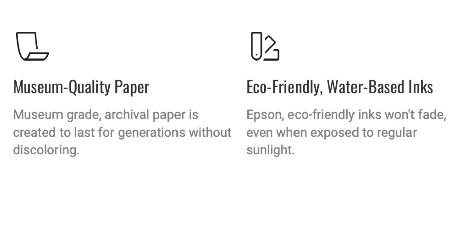 You'll receive a heavyweight, giclée, acid-free print that's created to last for generations. The museum-quality paper works perfectly with large, full-color images. The lightly-textured, matte finish captures fine lines and subtle colors, resulting in stunning works of art (without unwanted reflections).